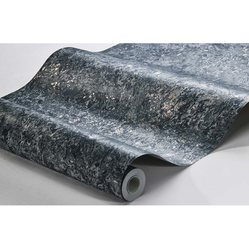 Papel pintado azul con toques de oro, lujoso y audaz. Inspirado en la roca italiana su superficie similar al mármol, bellamente mezclada, tiene un elegante efecto textil. Indicado para sala, comedor o pasillo para un espacio especial y suntuoso para entretener a amigos y familiares.