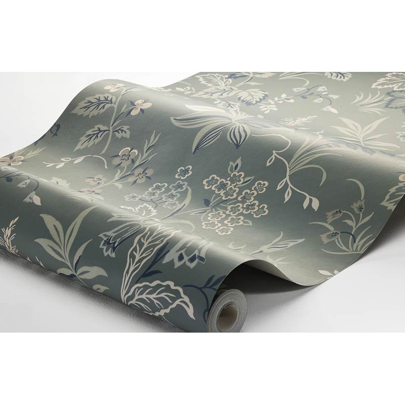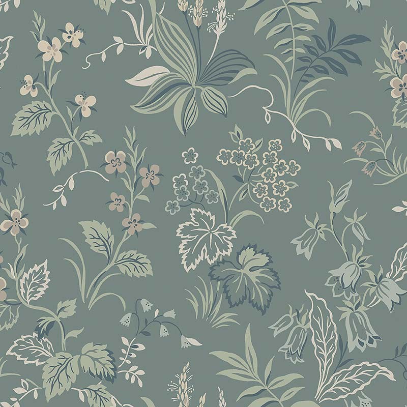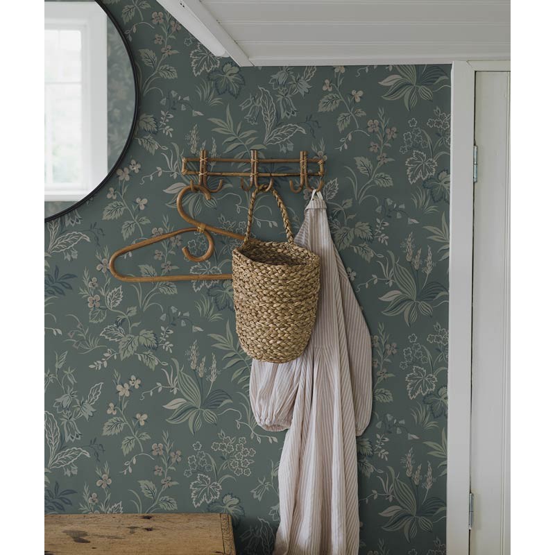Papel pintado verde crepúsculo oscuro con toques de verde oliva, azul índigo, gris turquesa, marrón y beige, el estampado Folklore en colagrafía presenta un diseño floral fresco de principios de la década de 1950. Llenando el espacio que lo rodea con una expresión viva y genuina, las flores en forma de campana, las delicadas nomeolvides y las hojas exuberantes trepan suavemente por las paredes. Indicado para dormitorio, salón o comedor para un estilo sublimemente escandinavo. Ideal como pared característica, también funciona maravillosamente en todas las paredes de una habitación.