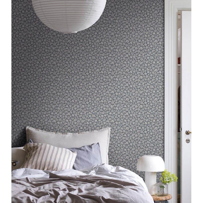 Papel pintado de azul niebla oscuro, beige y gris plateado claro, Skogsblomst agrega una sensación acogedora y decorada al espacio que lo rodea. Pintado a mano en acuarela, el encantador patrón denso de pequeñas flores delicadas es relajante y fresco, como un papel tapiz sólido. Indicado para el dormitorio, la sala de estar o la oficina y observe cómo las flores del bosque fluyen felizmente por las paredes.
