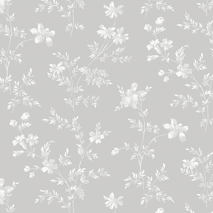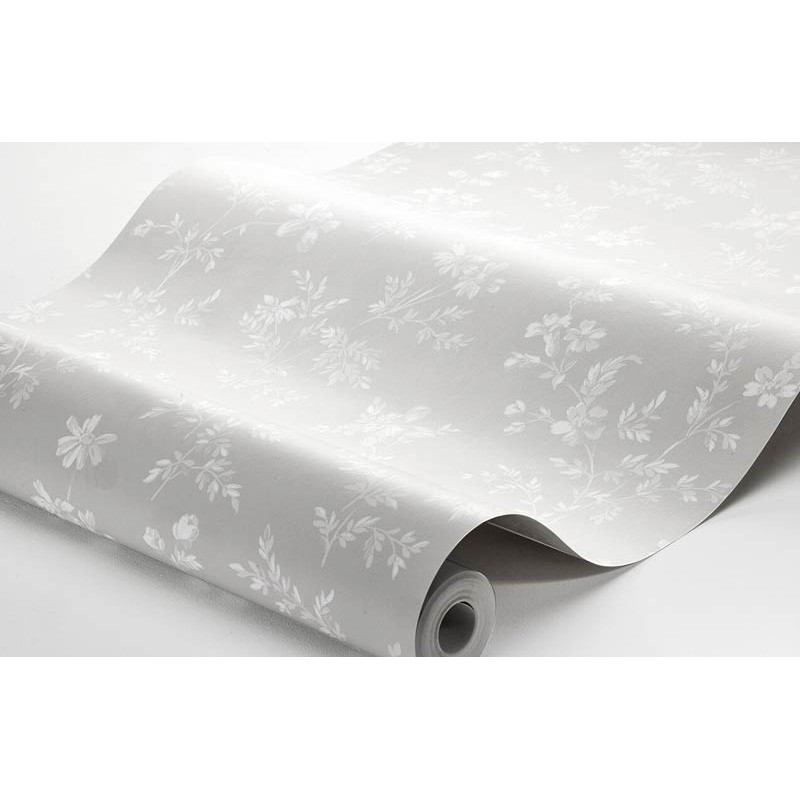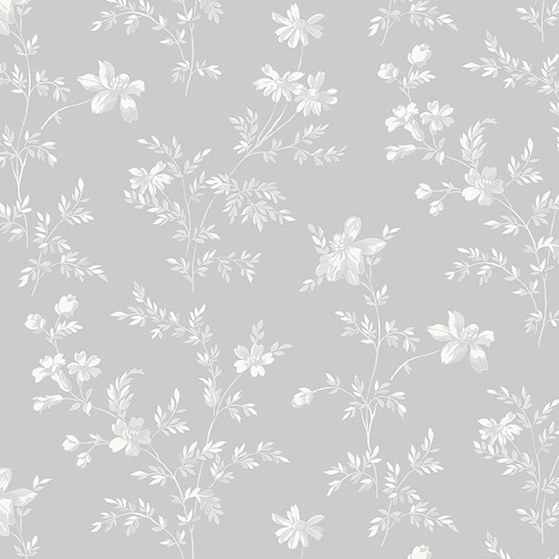 Papel pintado gris claro con detalles en blanco. Su diseño se inspira en la porcelana floral sueca tradicional con hermosas flores de prado elegantemente esparcidas por las paredes. Indicado para comedor, sala de estar o cocina para un espacio tranquilo pero animado en el que recibir a los invitados.