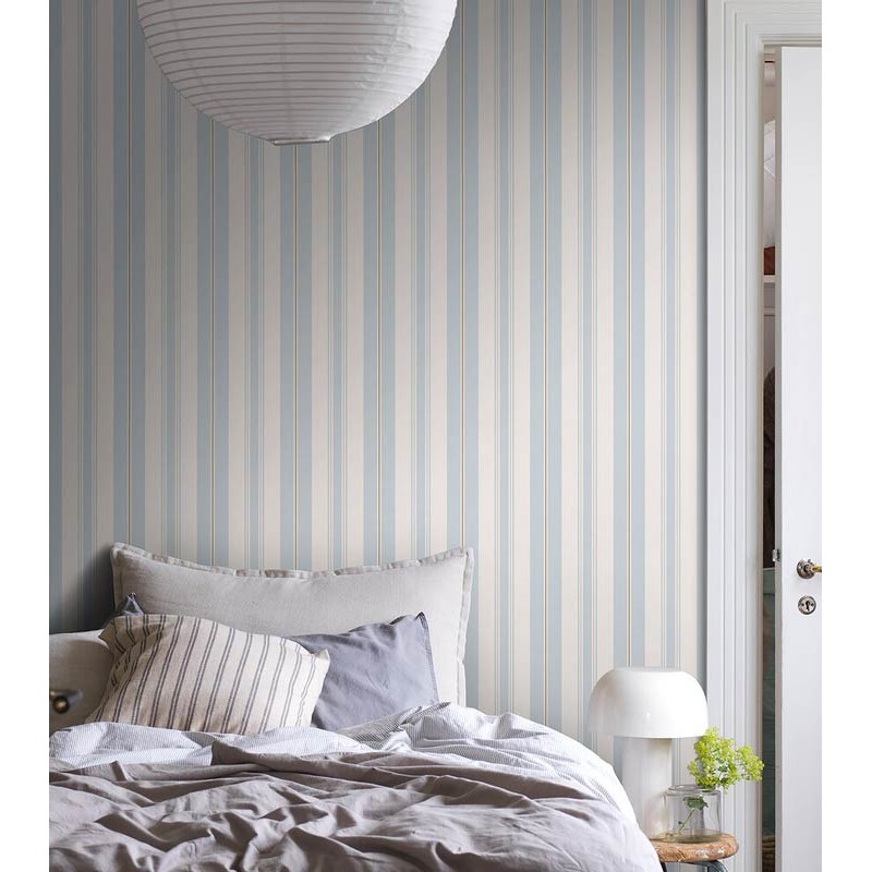 Papel pintado de color azul claro y blanco cremoso con toques de beige y dorado. Su patrón de rayas le da a las paredes profundidad e interés creando una sensación de espacio que funciona maravillosamente en todas las paredes de una habitación. Indicado para sala de estar, comedor o pasillo para una apariencia lujosamente encantadora que es clásica pero contemporánea.