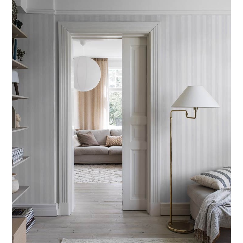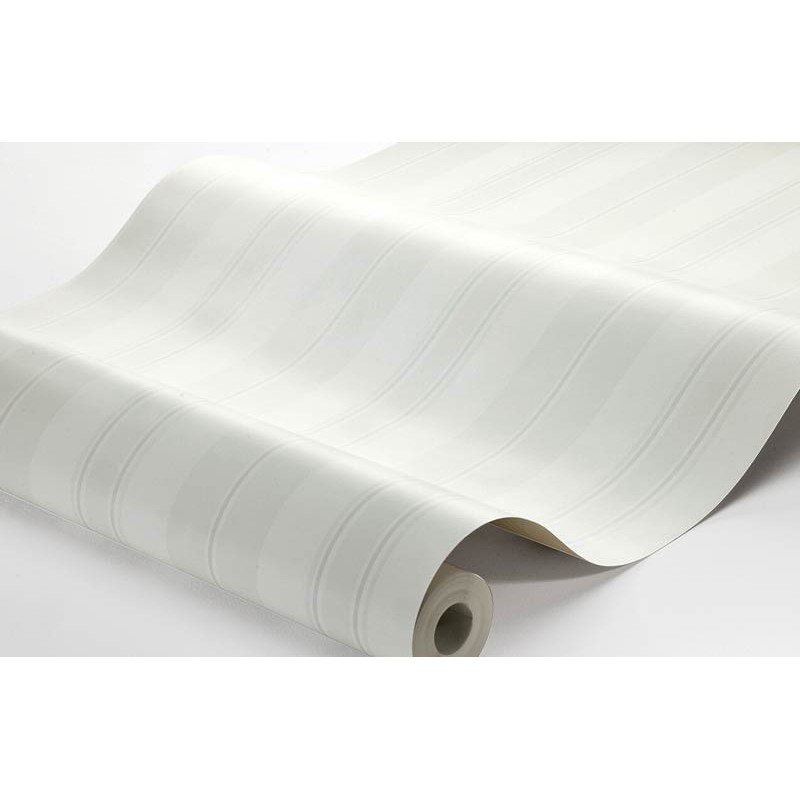 Papel pintado blanco perla sobre un fondo blanco fresco con toques de beige y gris, inspirado en la tradición sueca de almohadones bellamente tejidos, su coqueto patrón de rayas y su estampado collagraph le dan a las paredes una profundidad e interés genuinos y crean una sensación de espacio. Indicado para cocina, escalera o dormitorio para un estilo clásico escandinavo.