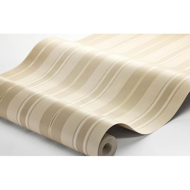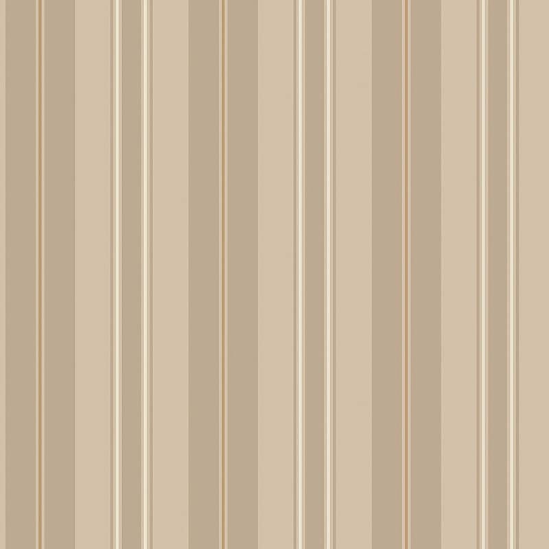 Papel pintado tonos cálidos de marrón beige sobre un fondo en tonos almendra con deliciosos toques de oro y blanco porcelana, su patrón de rayas tradicional pero contemporáneo le da a las paredes profundidad e interés y crea una sensación de espacio. Indicado para salón, oficina o dormitorio para una estética acogedora y atractiva.
