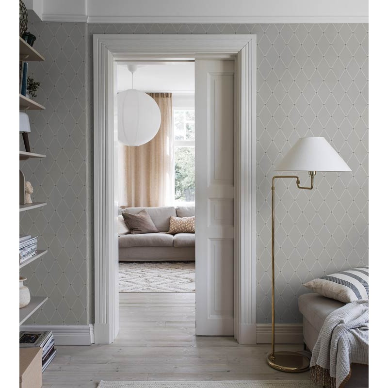 Papel pintado suave, tonos suaves de gris y crema con toques de oro, Fredrik es tradicionalmente clásico pero contemporáneo. Con un patrón de enrejado dibujado a mano compuesto por diamantes de todas las formas y tamaños, rezuma opulencia y placer mientras crea un ambiente espacioso y tranquilo