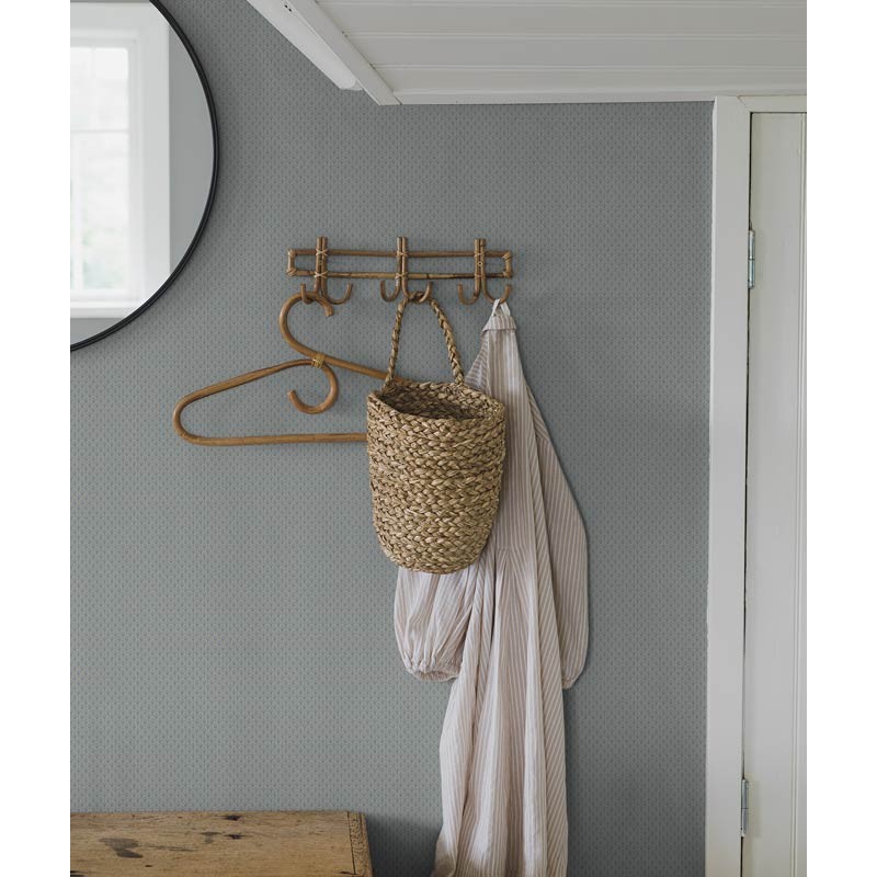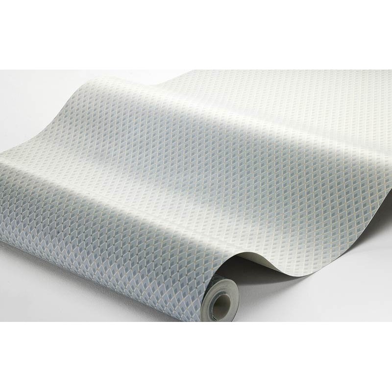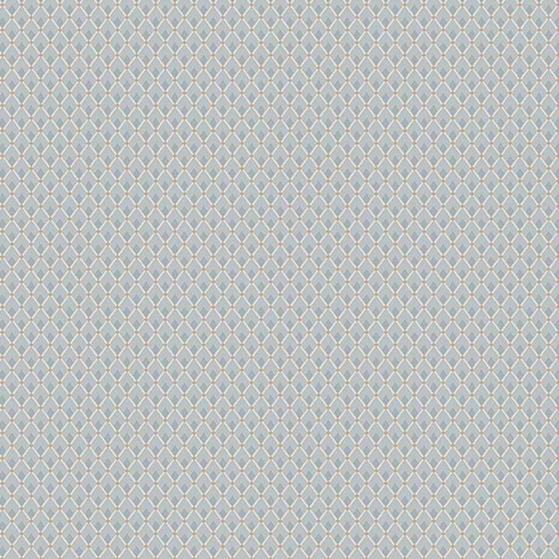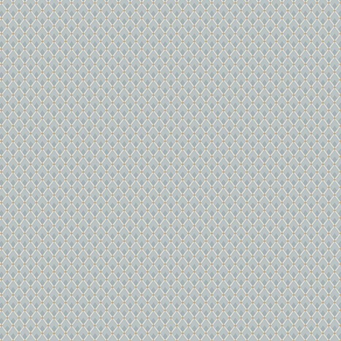 Papel pintado tono de azul paloma y patrón de enrejado decorado con puntos metálicos dorados se coloca en papel de impresión collagraph para crear un estilo hermoso y sofisticado con una expresión coqueta. Ideal salón, el comedor o la cocina para lograr una apariencia clásica con un toque contemporáneo.