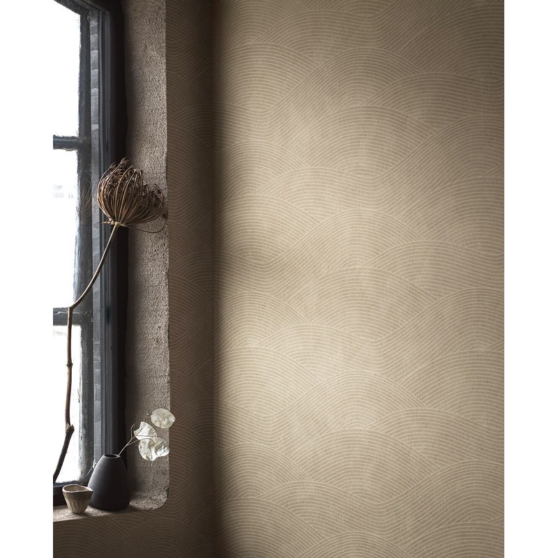 Tapete mit einer frischen beigen Palette, das Haväng Tapete zeigt ein geometrisches Design mit horizontalen Wellen, die sofort ein Gefühl der Ruhe vermitteln. Inspiriert von den sanften Wellen eines offenen ländlichen Landschaftsbildes, entfliehen Sie den Anforderungen des Alltags und schlendern Sie durch die ruhigen, fließenden Hügel Skandinaviens. Geeignet für Küche, Esszimmer oder Schlafzimmer für ein Aussehen voller klassischer, aber zeitgenössischer Ausdruckskraft.