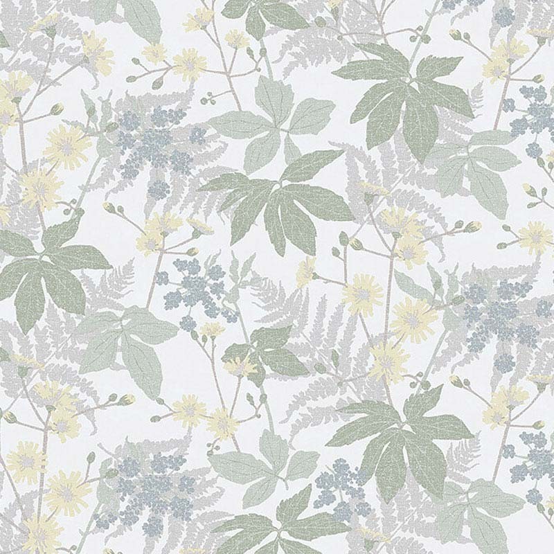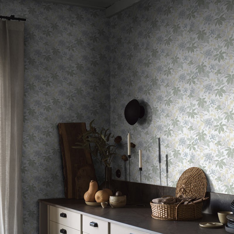 Papel pintado tonos frescos y relajantes de blanco y verde con toques de amarillo y azul, el papel tapiz Lindskog brinda comodidad y paz al espacio que lo rodea. Este nuevo patrón con su superficie textil se inspira en la flora y el follaje en constante cambio del suelo del bosque. Los helechos y saúcos crecen abundantemente bajo la sombra protectora de las copas de los árboles del bosque.