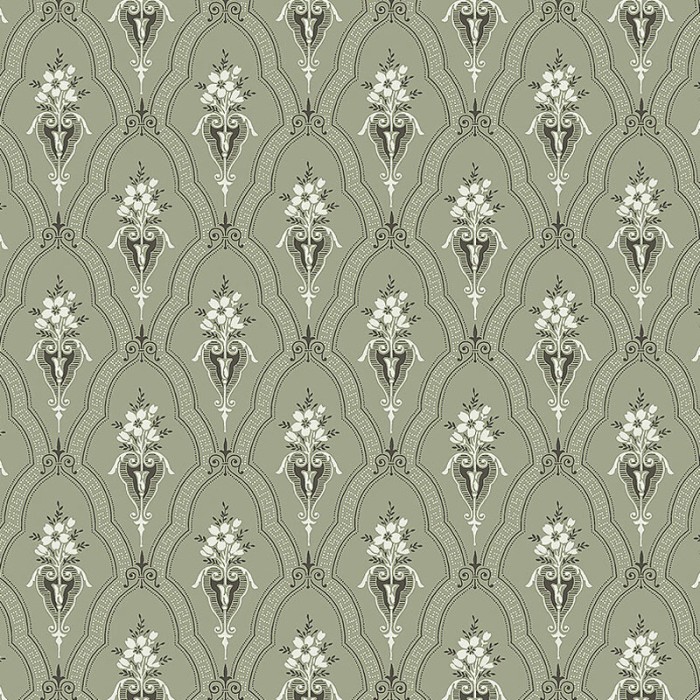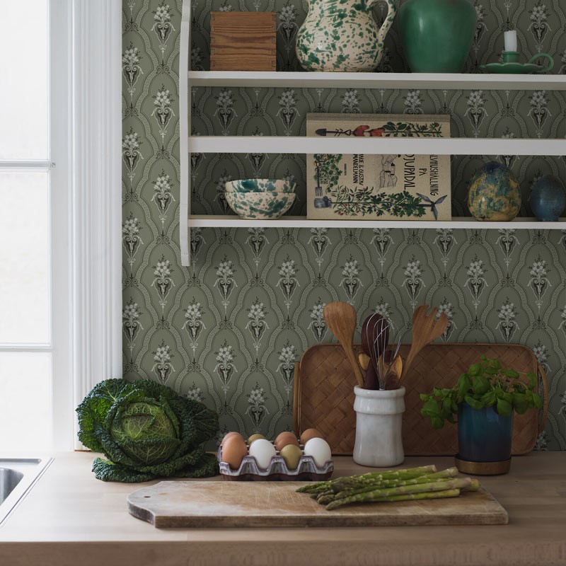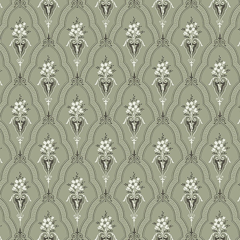 Papel pintado verde salvia, blanco fresco y negro suave. Un patrón de enrejado decorado con ramos de flores ornamentales en jarrones exquisitos trepa por las paredes para llenar el espacio circundante con calidez y comodidad. Indicado para sala de estar, cocina o dormitorio para un ambiente escandinavo relajante y rústico.