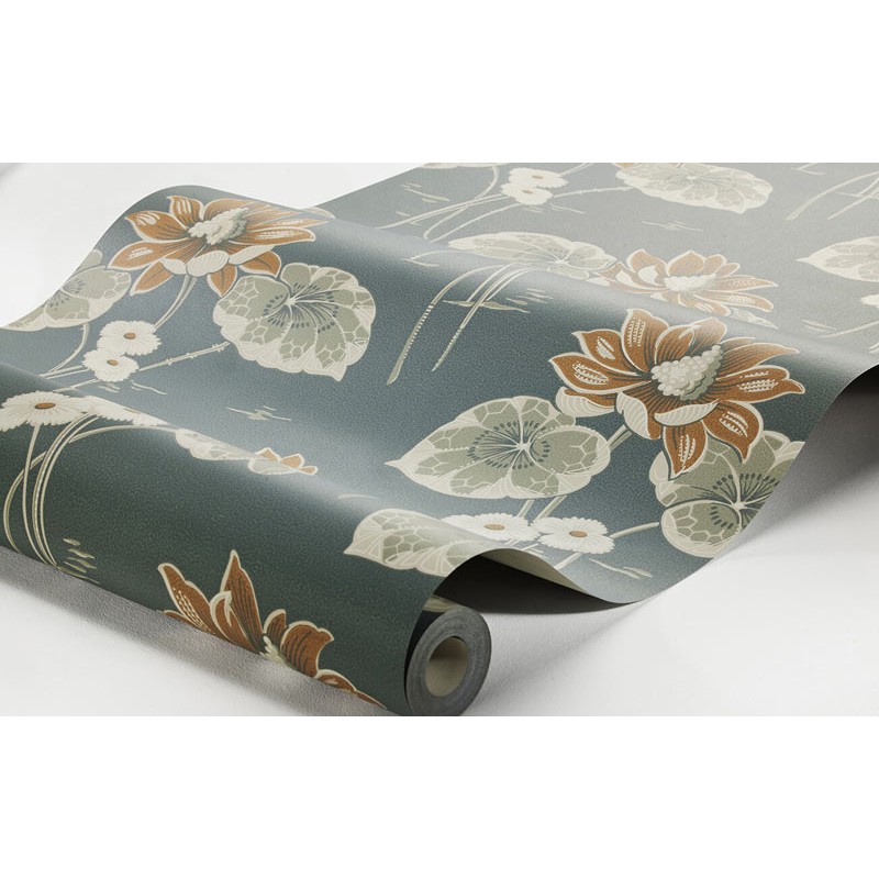 Papel pintado nenúfares Art Nouveau estilo escandinavo en verde y rosa de Borastapeter, colección Alla Tiders Hus. Calidad tejido no-tejido lavable, medidas: 53 cm x 10 m.
