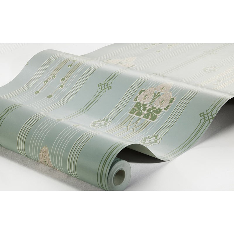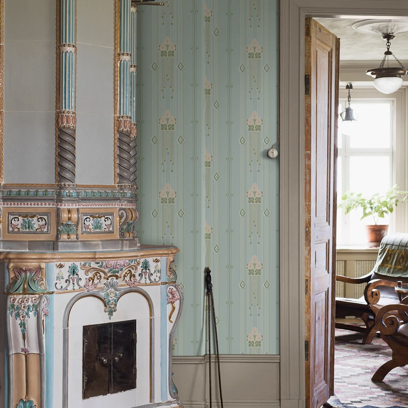 Des tons de bleu pâle du papier peint avec des détails dorés brillants, Villastan est élégant et luxueux. Avec un motif de lignes verticales orné de délicats médaillons et de roses de style Rennie Mackintosh, c'est une véritable célébration de la nature et de la période Art Nouveau. Idéal pour le salon, la chambre ou le couloir, pour une expression douce et élégante dans une maison moderne.