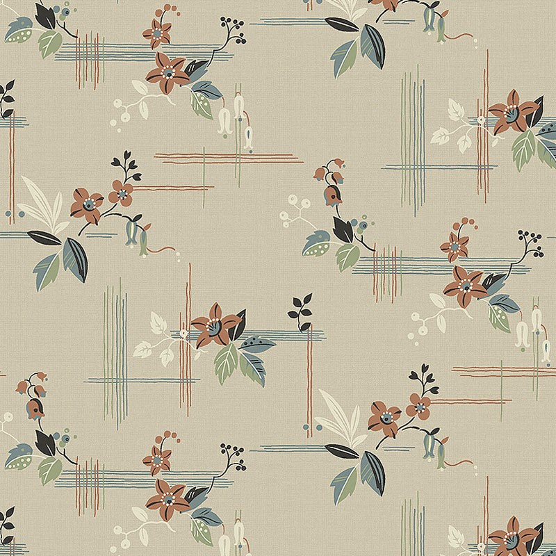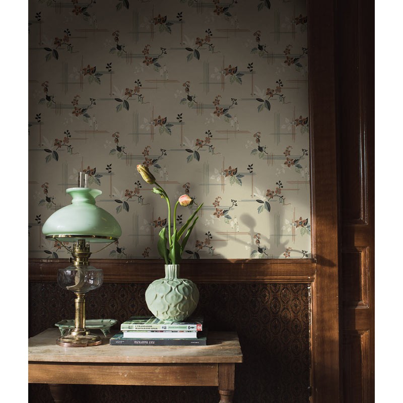 Papel pintado en tono beige cálido con toques de terracota, verde, marrón y azul, Salängen es clásico y elegante con un toque de intriga oriental. Con un patrón floral estilizado en combinación con un diseño lineal estricto, crea una estética formal pero acogedora. Indicado para dormitorio, cocina o recibidor para un carácter bonito y actual.