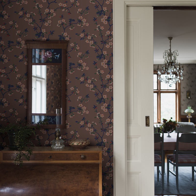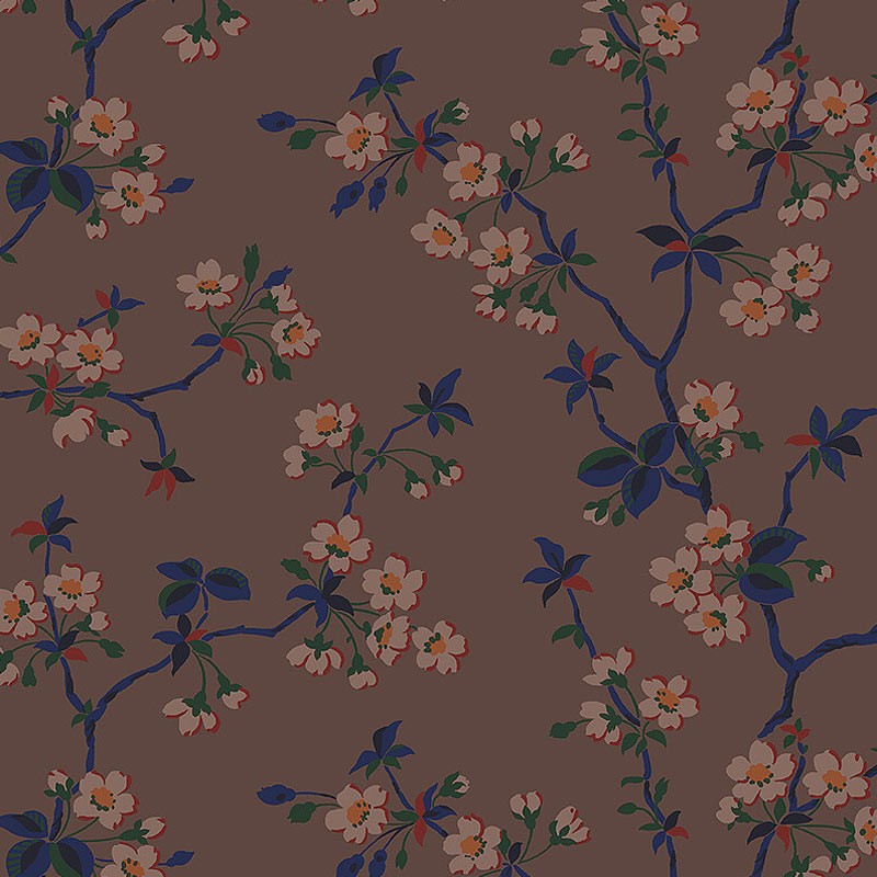 Papel pintado floral cerezo estilo oriental en beige y naranja de Borastapeter, colección Alla Tiders Hus. Calidad tejido no-tejido lavable, medidas: 53 cm x 10 m.
