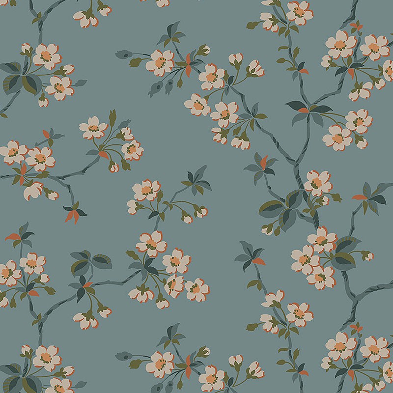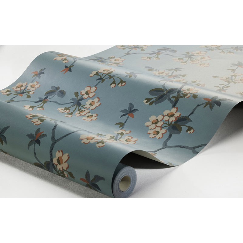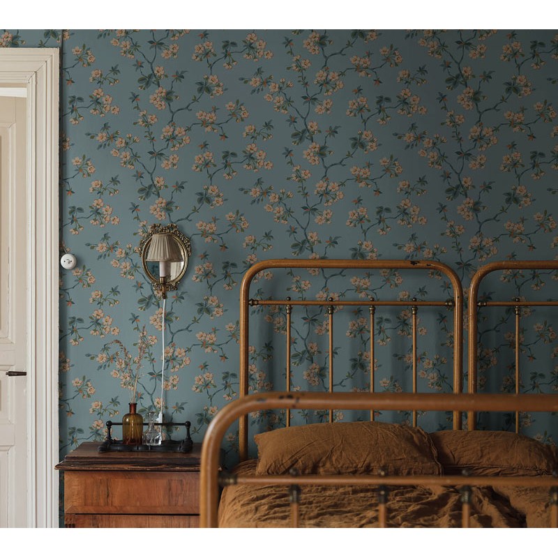 Papier peint floral cerisier style oriental bleu profond d´Borastapeter, collection Alla Tiders Hus. Qualité intissé et lavable, dimensions : 53 cm x 10 m.