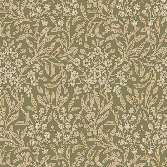 Papel pintado floral serpenteante estilo arts and crafts en beige de Borastapeter, colección Alla Tiders Hus. Calidad tejido no-tejido lavable, medidas: 53 cm x 10 m.