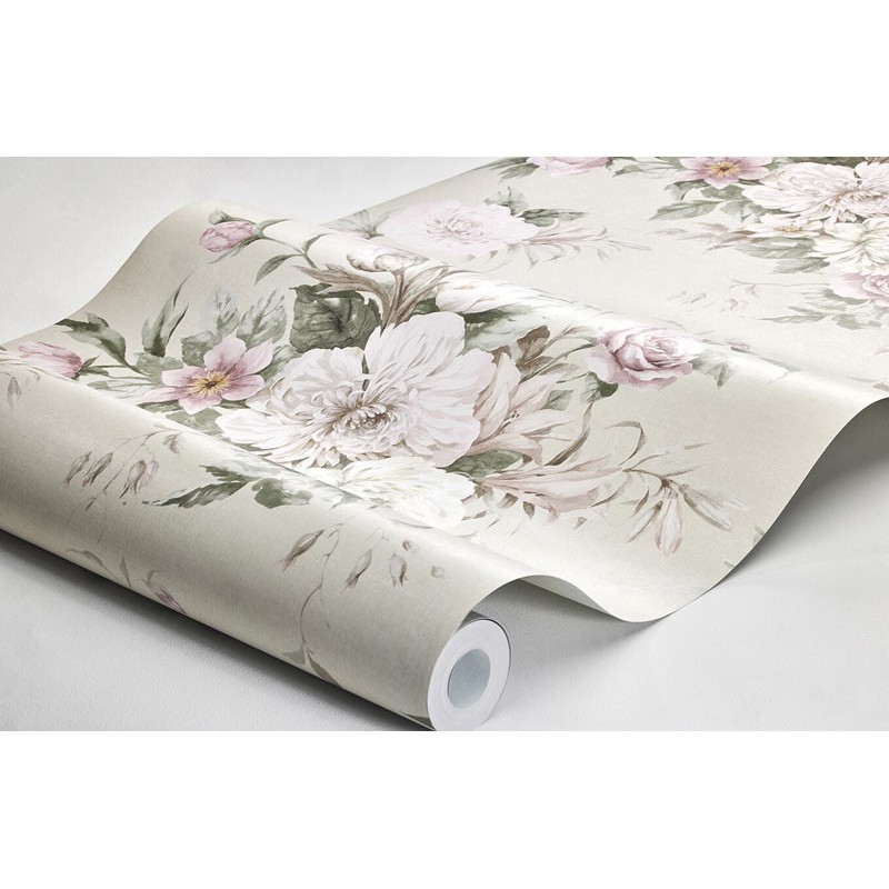 Papel pintado magníficos tonos pastel de rosa, albaricoque, blanco, verde y marrón sobre un fondo crema de tonos amarillos claros y apagados, Floral Charm wall es fresco, cálido y acogedor. Ramos de peonías en flor, lirios, anémonas y rosas con su exuberante vegetación visten generosamente las paredes para crear un ambiente acogedor y alegre en el que entretenerse y relajarse. Indicado para salón, dormitorio o recibidor para un estilo lujoso, lleno de interés y encanto.