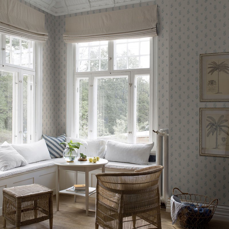 Papel pintado de un azul lavanda rústico y resplandeciente sobre un fondo de lino beige, Petit Fleurs wall es tranquilo, acogedor y clásico. Con un hermoso diseño pintado a mano de pequeños ramos de flores, es una combinación perfecta de estilo escandinavo y diseño francés del siglo XVIII. Indicado para cocina, salón o pasillo para una estética fresca y acogedora.