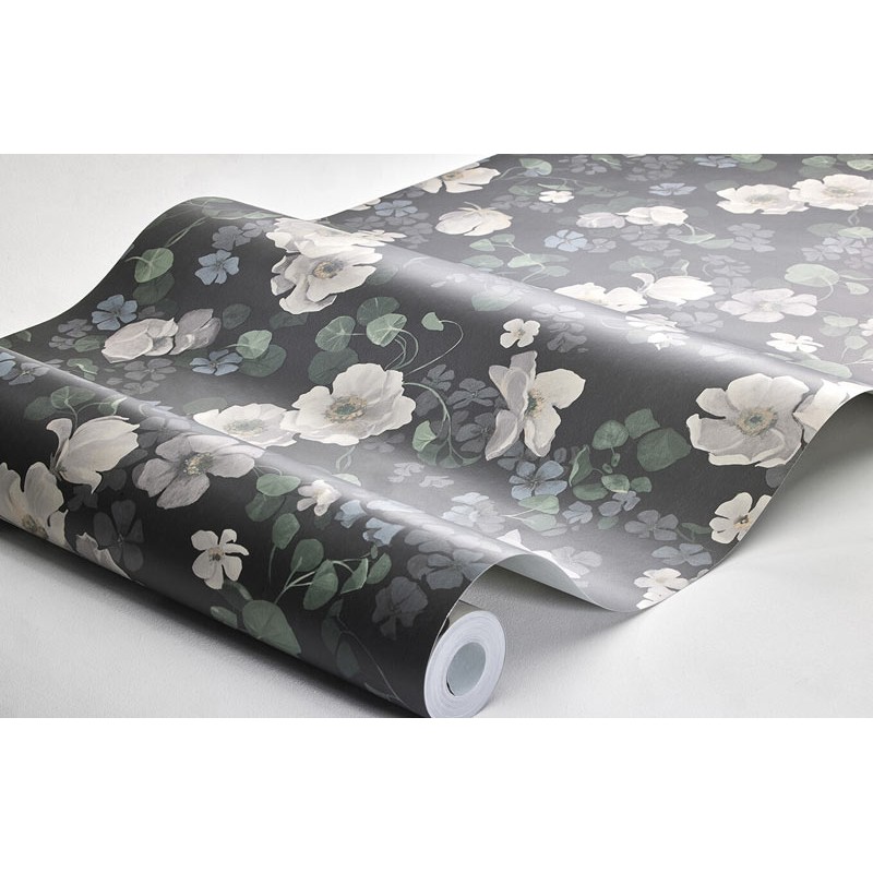 Papel pintado de flores beige apagado, blanco, azul y púrpura mezclado con hojas en tonos verde jade sobre un fondo negro gris oscuro, crea un ambiente nocturno. El patrón floral oscuro similar al crepúsculo de Enchanting Flower le da un toque de magia y encanto al espacio circundante. Indicado para sala de estar, pasillo o dormitorio para un ambiente audaz, botánico e impresionante.