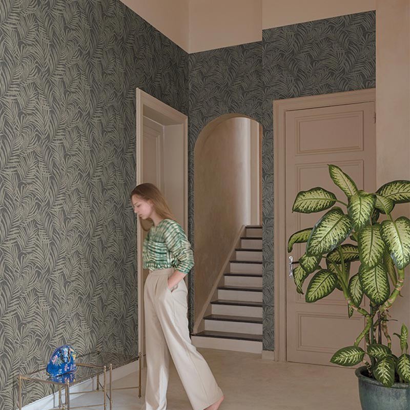 Papel pintado tropical gris plata textura. Dale vida a tus paredes ideal para el recibidor. Combina perfectamente con estilos modernos y clásicos.