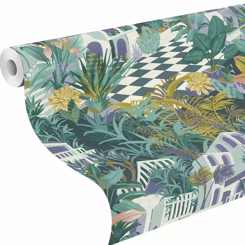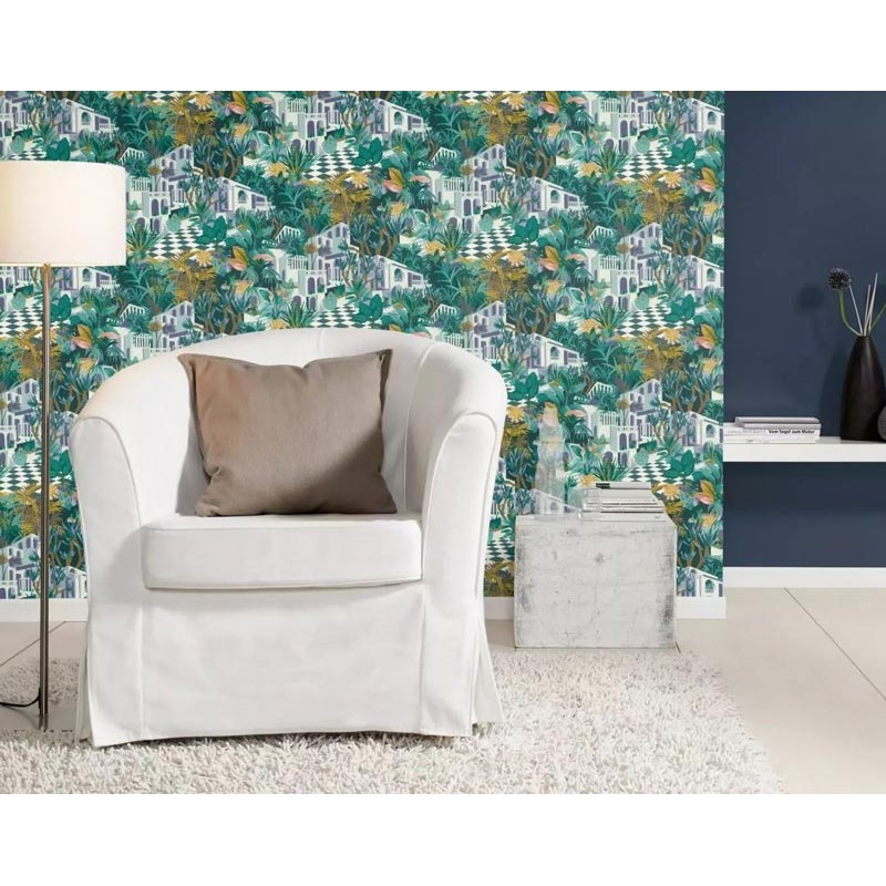 Papel pintado paisaje tropical bungalows multicolor de Rasch, colección Tropical House. Calidad vinílico lavable, medidas: 53 cm x 10 metros