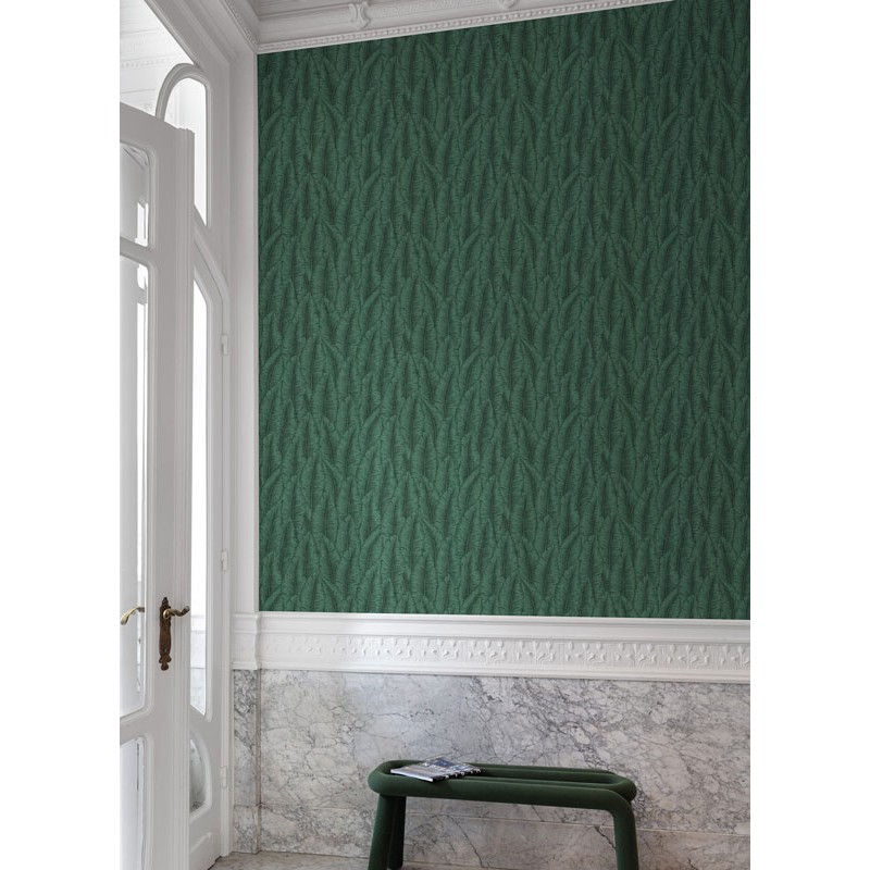 Papel pintado hojas tropicales cumarú verde. Aporta un toque único para el salón. Combina perfectamente con estilos modernos y clásicos.