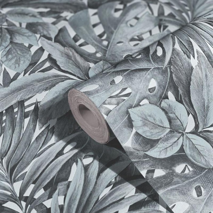 Papel pintado hojas grandes tropical gris, con textura y diseño diferenciador. Marburg Botanica 33305.