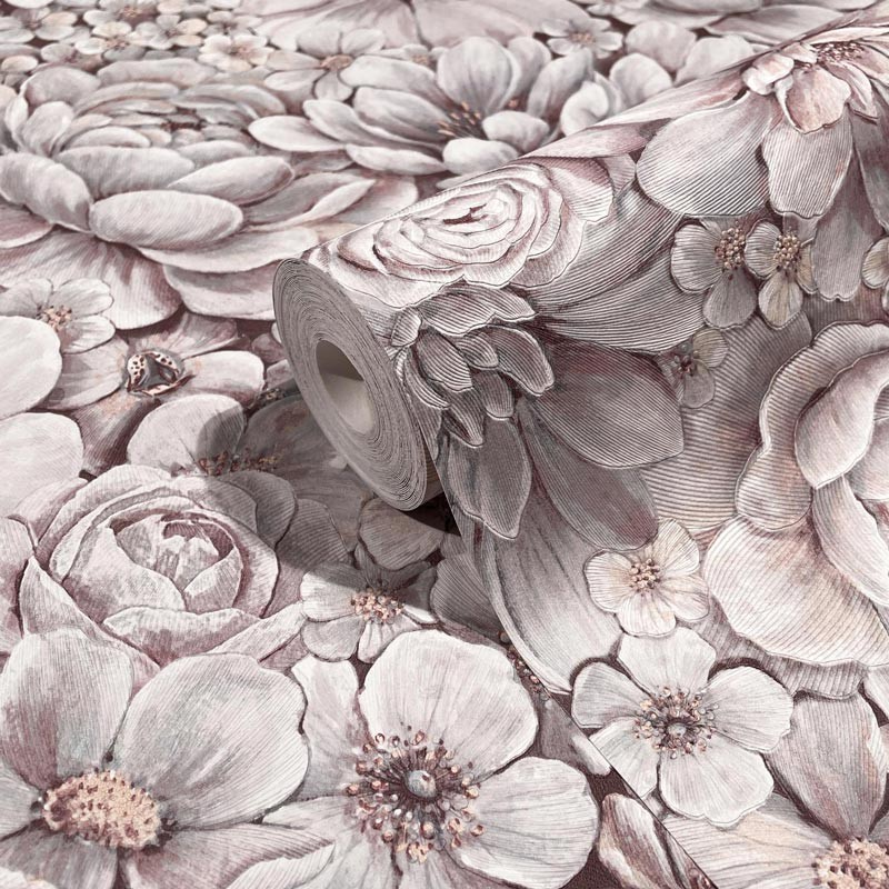Papel pintado floral romántico grey, con un efecto visual llamativo. Marburg Botanica 33951.