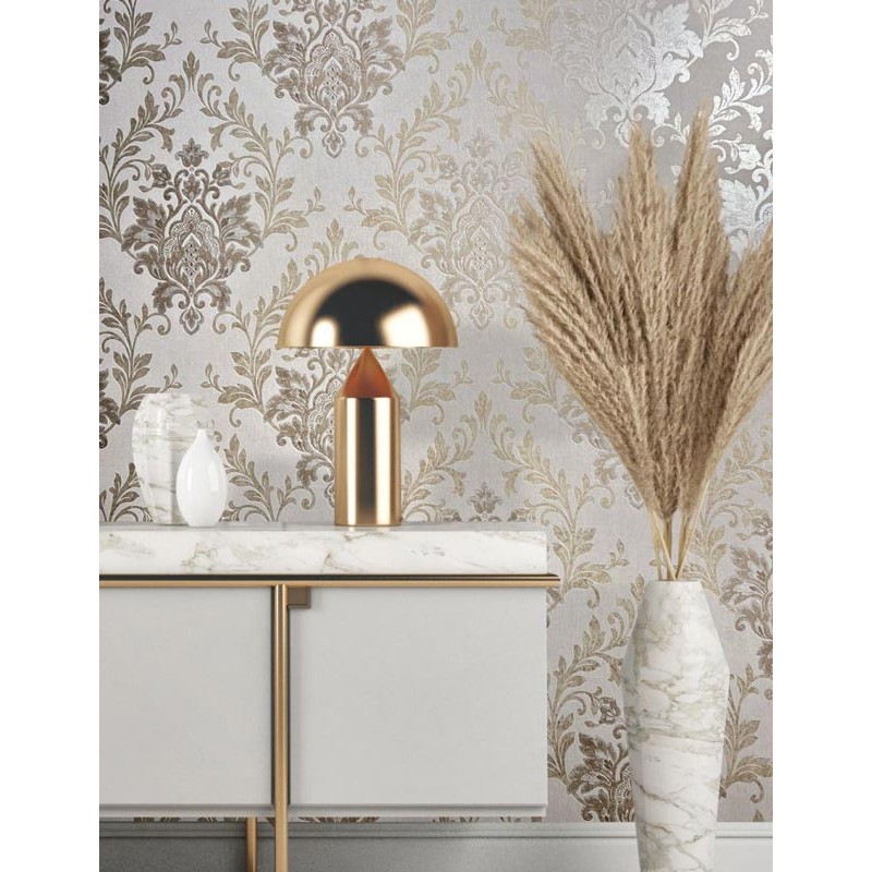 Decoración que envuelve y aporta identidad, papel pintado estilo damasco beige y dorado Marburg Villa Romana 31569.