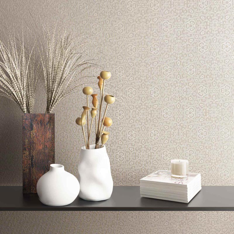 Perfecto para crear atmósferas únicas, papel pintado arabesco filigrana ornamental gris plata Marburg Villa Romana 32969.