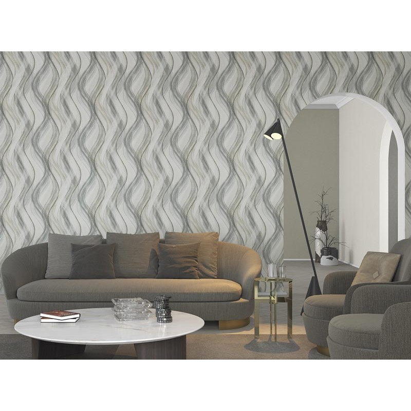Papel pintado formas de ondas verde acuarela, aporta elegancia y personalidad. Marburg Shades 32442.