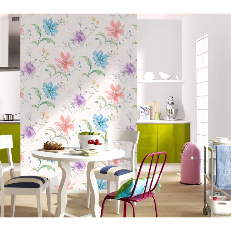 Papel pintado floral multicolor efecto textil, con textura y diseño diferenciador. Marburg Shades 32454.