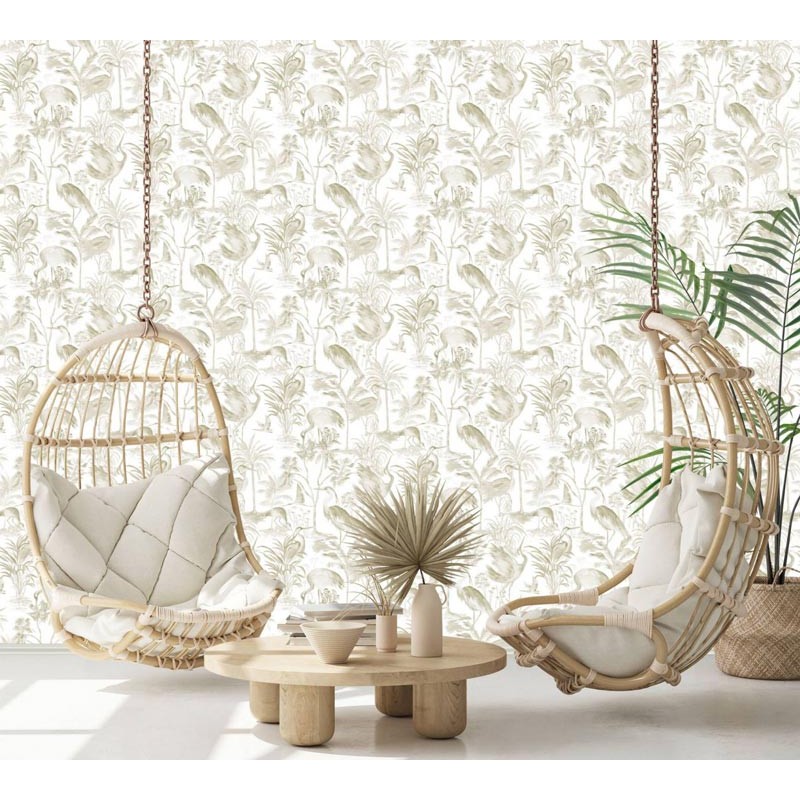 Papel pintado floral tropical con garzas rosa, ideal para destacar tus paredes. Marburg Spirit Of Jungle 47401.