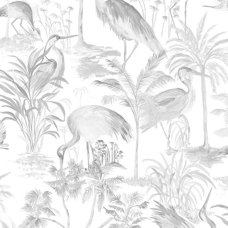 Papel pintado tropical flores con garzas gris, con textura y diseño diferenciador. Marburg Spirit Of Jungle 47404.