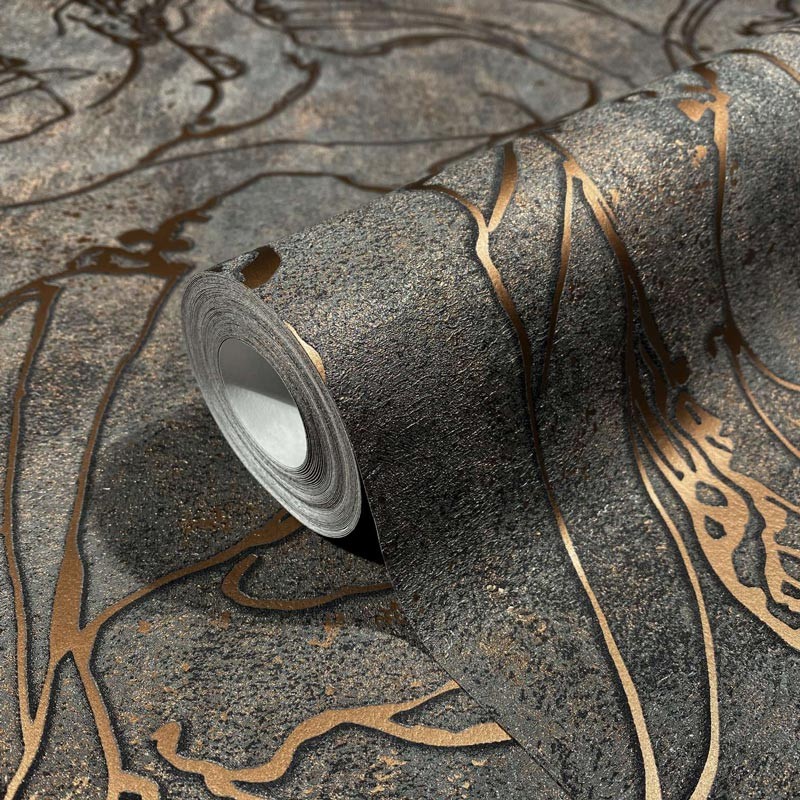 Papel pintado contemporáneo negro y dorado metalizado, aporta elegancia y personalidad. Marburg City Glow 34257.