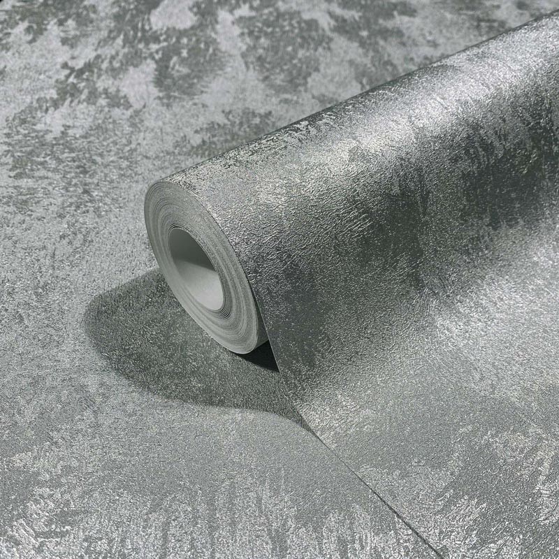 Papel pintado moderno textura metalizada gris y plata, con textura y diseño diferenciador. Marburg City Glow 34281.