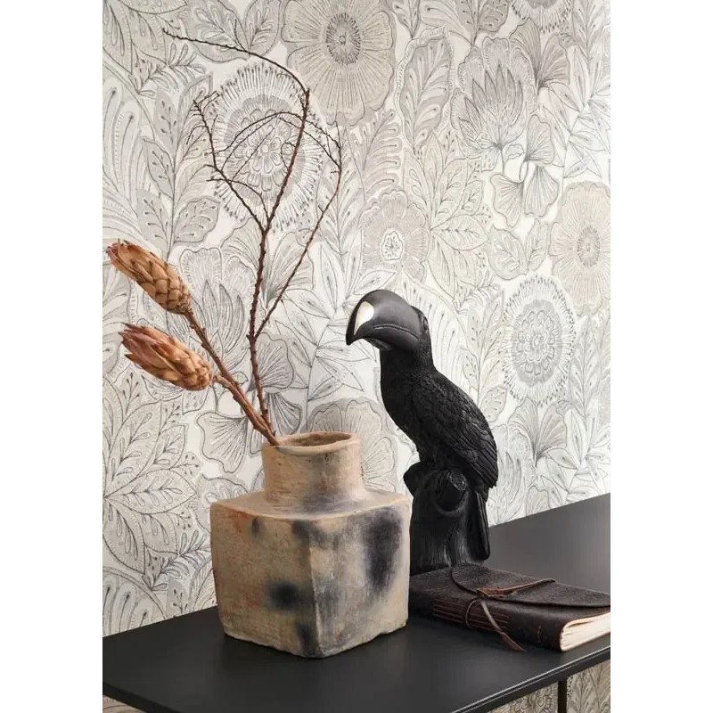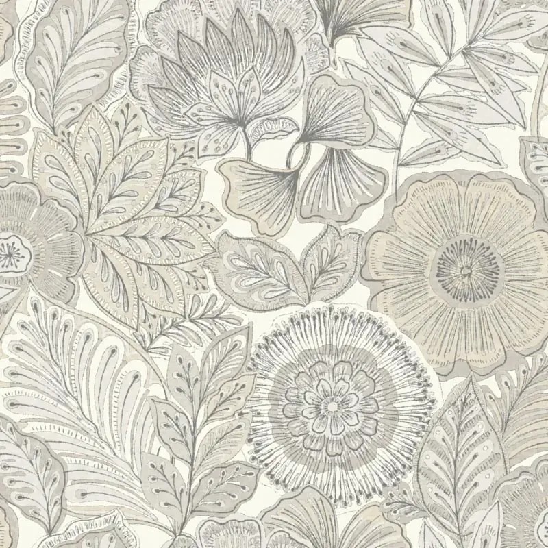 Papel pintado flores grandes beige efecto batik, ideal para salones o dormitorios que buscan frescura y armonía natural.