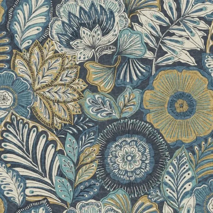 Papel pintado flores grandes amarillo mostaza efecto batik, con encanto floral para crear ambientes serenos y acogedores.