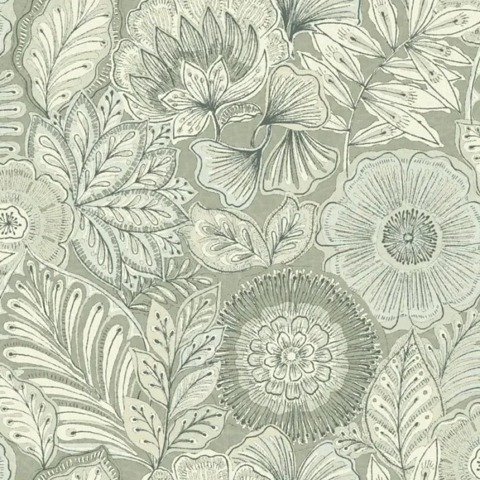 Papel pintado flores exóticas verde efecto textil, con encanto floral para crear ambientes serenos y acogedores.