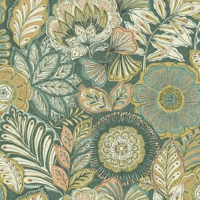Papel pintado flores exóticas verde efecto textil, con encanto floral para crear ambientes serenos y acogedores.