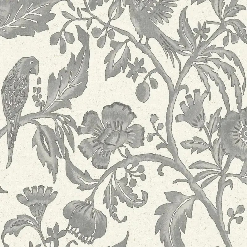 Papel pintado flores vintage beige negro y guacamayos, con encanto floral para crear ambientes serenos y acogedores.