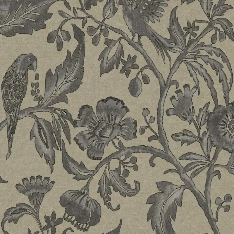 Papel pintado flores vintage gris y guacamayos, una opción luminosa y suave para interiores con inspiración botánica.