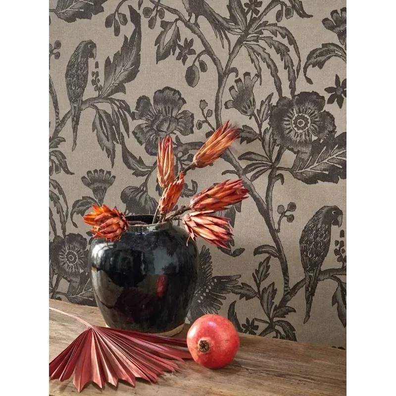 Papel pintado flores vintage beige y guacamayos, ideal para salones o dormitorios que buscan frescura y armonía natural.