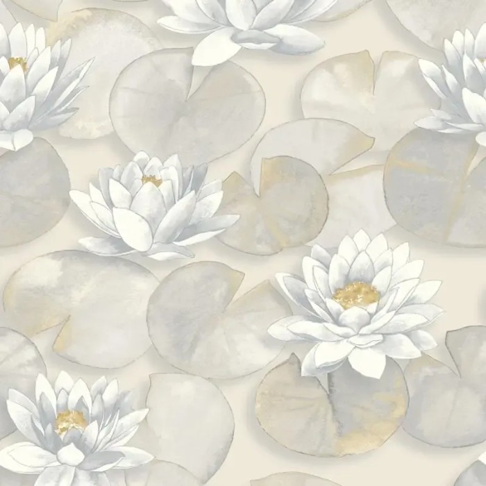 Papel pintado floral estilo oriental nenúfares blancos, una base cromática neutra que combina fácilmente con cualquier decoración.