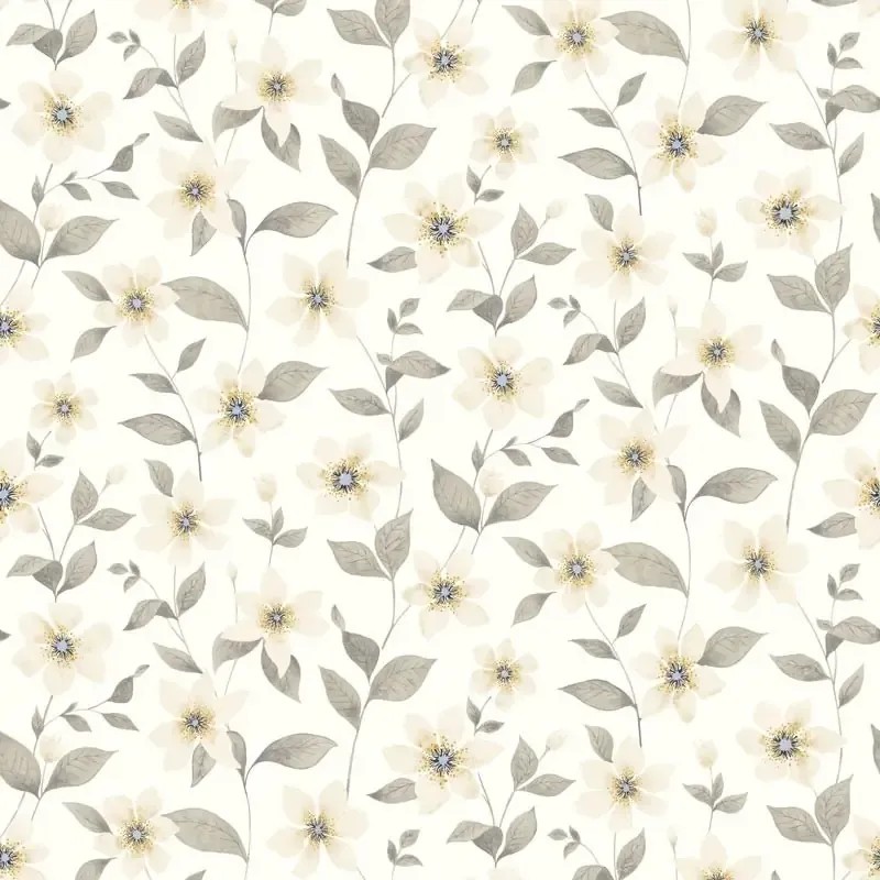Papel pintado romántico flores de clematitas gris azulado, en tonalidades equilibradas que aportan paz visual al ambiente.