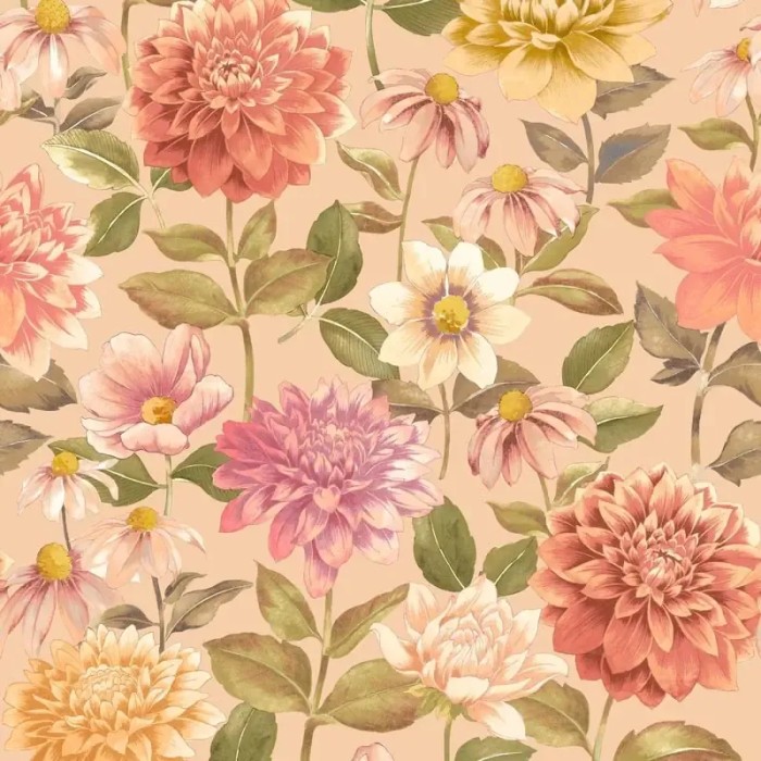 Papel pintado floral flores grandes, dalias multicolor, una elección sofisticada para renovar espacios con inspiración orgánica.