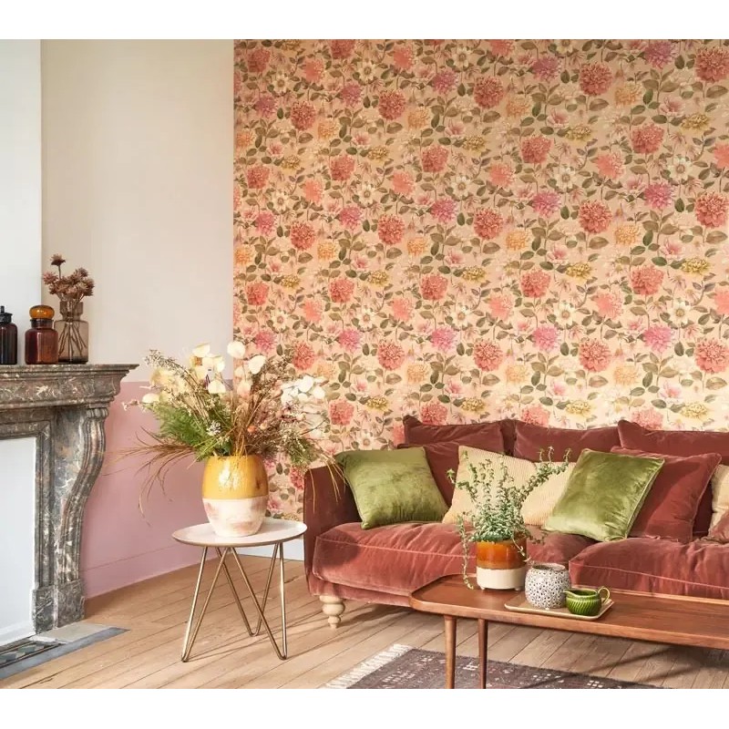 Papel pintado floral tonos pastel, flores grandes de dalias, una elección sofisticada para renovar espacios con inspiración orgánica.