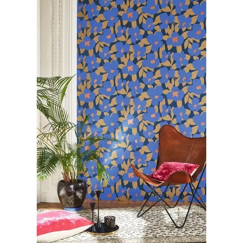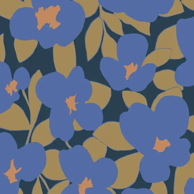 Papel pintado flores retro azul y beige estilo vintage, ideal para atmósferas luminosas, sobrias y elegantes.