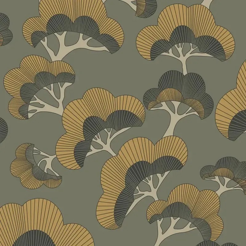 Papel pintado flores japonesas moderno con pino japonés efecto brillo, una elección sofisticada para renovar espacios con inspiración orgánica.