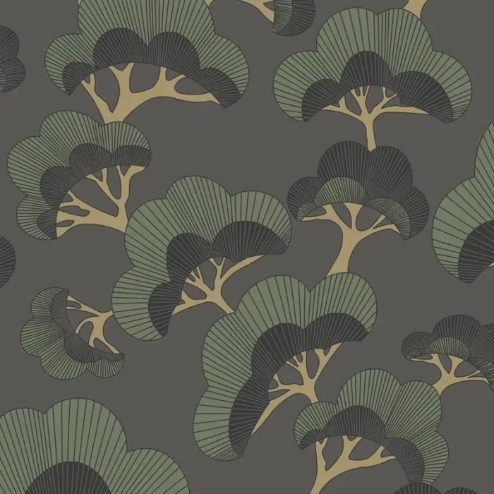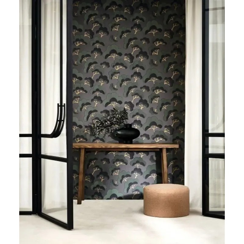Papel pintado estilo japones moderno con pinos orientales verde caqui, una solución versátil para transformar cualquier estancia con estilo natural.
