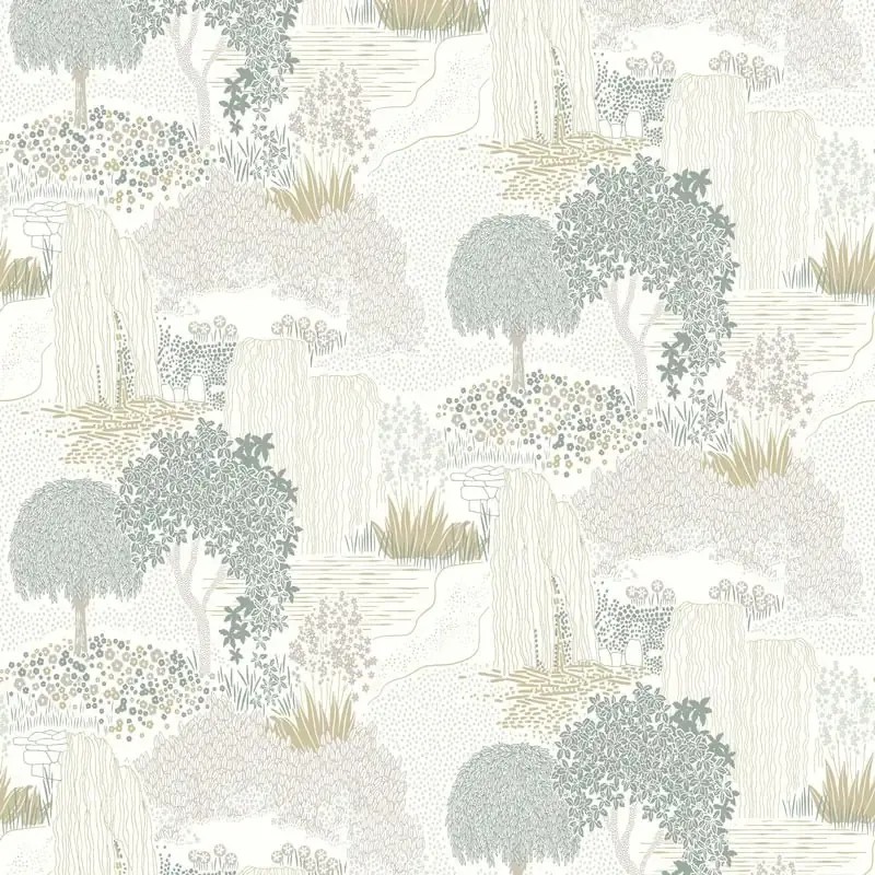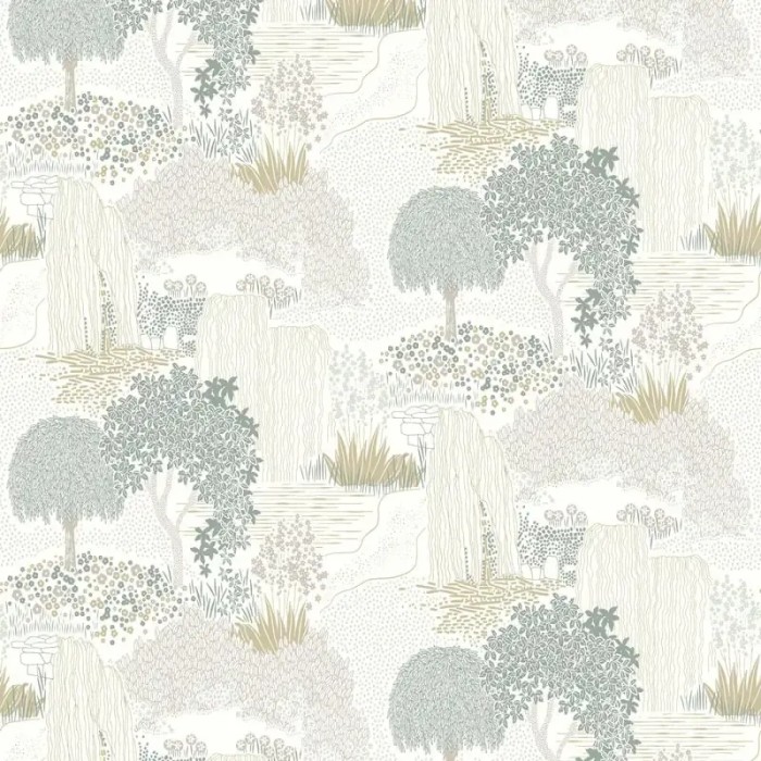 Papel pintado estilo oriental, jardín botánico japonés blanco, en tonos suaves que amplían visualmente el espacio y aportan claridad.