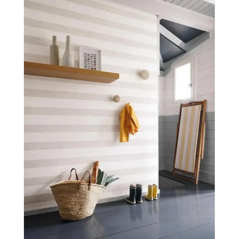 Las anchas rayas del papel pintado “Alizé” se han creado con una textura tejida y una paleta suavizada, que aportan mucha elegancia y personalidad.